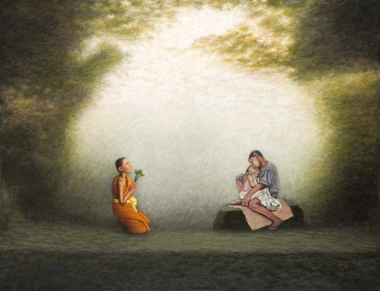 What else? And then you see people? How do you feel? Pitiful? Do you think that the brother in this painting has passed away? Right? I don’t know whether he has passed away? I think he is probably really sick or that his older brother is holding him in his arm, gently leaning against his face? Right? And there is a monk to the left of the painting. He is praying for him.