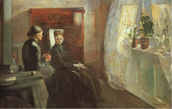 As spring conquered the long, white winter, a mild light and a fresh wind came in through the window, lighting up the room. We then see this weary young lady, seated with her head against a pillow. From a viewer’s perspective, which might once be the same perspective as the painter, we can see her face; tired, with her eyelids closed. From our line of vision to the left, there seated an older lady, next to the one who was sick. We cannot see her face, but from the angle of her position, we can tell that she was gazing towards the window and the light. In comparison, her ruddy skin made the young lady’s seemed even more pale. We continue to move our sight to the extreme left, towards the end of the canvas. Here on a table, we can see a glass bottle and objects resembling medicine. These can be supportive evidence that someone in the room was sick. Many believe that the picture was inspired by the painter’s beloved young sister, who died of tuberculosis in 1877. Illness and cure, disappointment and expectation, death and life; the painter expressed a piece of this journey in life upon this canvas, and it is considered as one of his best works of the period. |