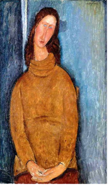 We see this woman named Jeanne Hebuterne, in a yellow jumper from Modigliani’s perspective. In this famous figure form of Modigliani, she was depicted with elongated proportion, and her light blue eyes without pupils, seemed to smile slightly, yet with sorrow. We can see her fingers intertwined, cupping a baby bump. She wore a warm color tone outfit, surrounded by a contrasting blue background, which brings out the emphasis of the figure. Through the intimacy of a husband and wife, Modigliani depicted Hébuterne as a form to present his artistic perspective. Besides the affection and the artistic way of expressing his personal view, we wonder if there is any other reasons that made him see things uniquely? According to information we can find about the painter, Modigliani had been using alcohol and drugs to mask his long-term health problems, including tuberculosis, the leading cause of death in France during the 1900s. We also learnt that this painting was actually completed in the final days of the couple. Do physical pain and the after effects of alcohol and drugs distort Modigliani’s perspective? We have no answer. All we can try to understand is that this surreal form comes from a deep pain from different aspects while trying to find a purpose in life. |